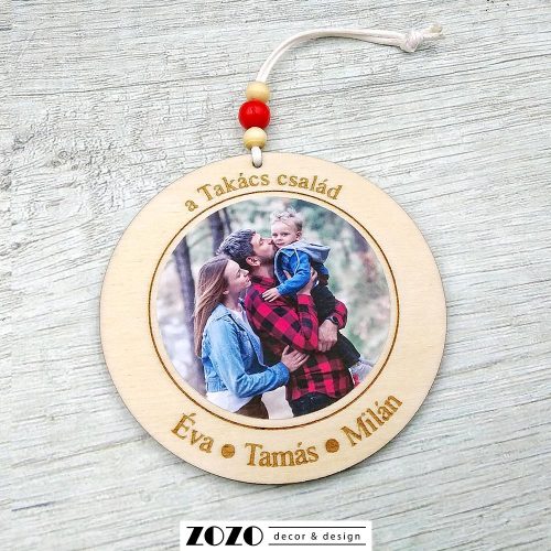 Éld át a karácsony varázsát ezzel a fából készült különleges dísszel, melyet a családi fotótokkal, névvel és évszámmal egyedileg készítünk el neked! De nem csak családi fotóval, hanem bármilyen képpel és szöveggel elkészítjük!Igény szerint a dísz hátoldalát is gravírozzuk általad megadott egyedi szöveggel, idézettel, ezt az opciót a legördülő menüben válaszd ki!Személyre szabottan, az általad megadott fotóval és szöveggel válik különleges dekorációvá, vagy szívhez szóló egyedi ajándékká. Minden egyes darab kézműves szeretettel készül, hogy igazi kinccsé váljon a családi ünnepek alatt. Kösd a karácsonyfa legszebb ágára, vagy akaszd ki a lakásod egyik kiemelt pontjára! Ha pedig meghitt pillanatokat okoznál vele szeretteid számára, egyedülálló ajándék is válhat belőle. Rendeld meg most, hogy az idei karácsony igazán személyessé váljon! Elkészítés:Az általad megadott adatok alapján készítjük el, amiket az erre vonatkozó szövegdobozokban tudsz beírni, vagy rendelés után elküldeni e-mailben, az info@zozodesign.hu címre!Amint a szerkesztési munkálatok befejeződtek, e-mailben fogsz kapni látványtervet egyeztetésre. Miután azt megtekintetted és jóváhagytad, csak azután készítjük el a teljes megrendelésed és adjuk át szállításra. Így biztosan egy olyan terméket fogsz kézhez kapni, amilyet megálmodtál.Termékinfó:Gondosan válogatott és kezelt anyagokból, precíz megmunkálással készül. Megvásárlásával egy szép, és igazán minőségi, valódi kézműves terméket kapsz kézhez.Anyaga: 3 mm vastag nyírfaMérete: 7,5 cm átmérőjű + 8 cm zsinórA fotó kasírozással (ragasztással) kerül fel a díszre