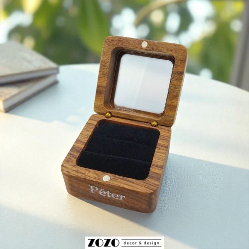 Ez a diófából készült gyűrűsdobozka a ti szerelmetek történetét meséli el, igazán személyessé a fedelére kerülő egyedi gravírozás teszi. A doboz belseje puha, bész színű bársonybetéttel van ellátva, mely védelmet nyújt a gyűrűknek, a biztonságos záródásért pedig a dobozba épített diszkrét mágnesek felelnek.