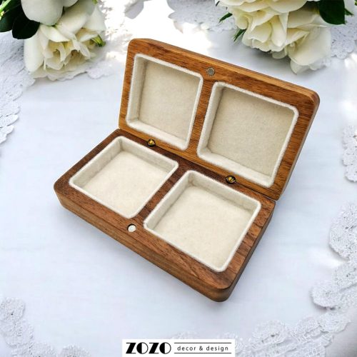 Két név, egy dátum, és egy életre szóló ígéret.Ez a diófából készült gyűrűsdobozka a ti szerelmetek történetét meséli el, igazán személyessé a fedelére kerülő egyedi gravírozás teszi. A doboz belseje puha, bész színű bársonybetéttel van ellátva, mely védelmet nyújt a gyűrűknek, a biztonságos záródásért pedig a dobozba épített diszkrét mágnesek felelnek. Elkészítés előtt e-mailben fogsz kapni egy látványtervet.A dobozka méretei:10 cm széles5,6 cm mély3 cm magasAnyaga: diófa2 db gyűrű tárolásásra alkalmas