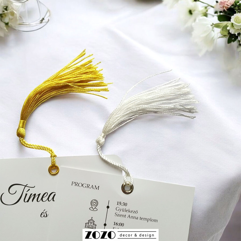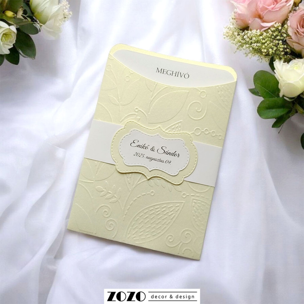 A "FrenchLove" esküvői meghívó kollekciómat a romantika fővárosa Párizs, és a kifinomult francia elegancia ihlette, ebből kiindulva az egyes típusokat a legszebb francia női nevekkel illettem. Ebben az esetben a "Claire" névre esett a választás, aminek a jelentése fényes, tiszta, ragyogó.A meghívó tokját gyöngyházfényű, fehéraranyszínű csillogó alapanyagból készítem, melyet a virágmintás 3D-s dombornyomott minta tesz igazán különlegessé. A meghívó lapja minimalista letisztult dizájnt képvisel, melyen a nyomtatás lehet akár kétoldalas is, hogy minden fontos információ elférjen rajta, pl a hátoldalán a program, vagy akár egy általad választott idézet. A meghívó szövegezése lehet a mintaképekhez hasonló, vagy teljesen egyedi szöveget is megadhatsz. A szövegezés és a látványerv egyeztetésének egyszeri díja +3000 Ft. A szükséges szövegeket rendelés után küldd el az info@zozodesign.hu e-mail címemre!Minimálisan rendelhető mennyiség: 10 dbMérete tokkal együtt: kb 10 cm széles és 15 cm magasElkészítési idő: áltagosan 7 munkanap Extrák és variációk:∎ Kérheted 3D domborítás nélkül is, csak simán a gyöngyházfényű tokban.∎ Kérheted színben hozzáillő díszpánttal (haspánttal), melyre a neveitek és a dátum kerül nyomtatásra, vagy enélkül is.∎ Kérheted arany vagy ezüst színű bolyttal.∎ Kérheted a tokot más színben is. El tudom készíteni sok fajta színvariációban, ezesetben előre egyeztessünk, szívesen küldök színmintákat e-mailben.