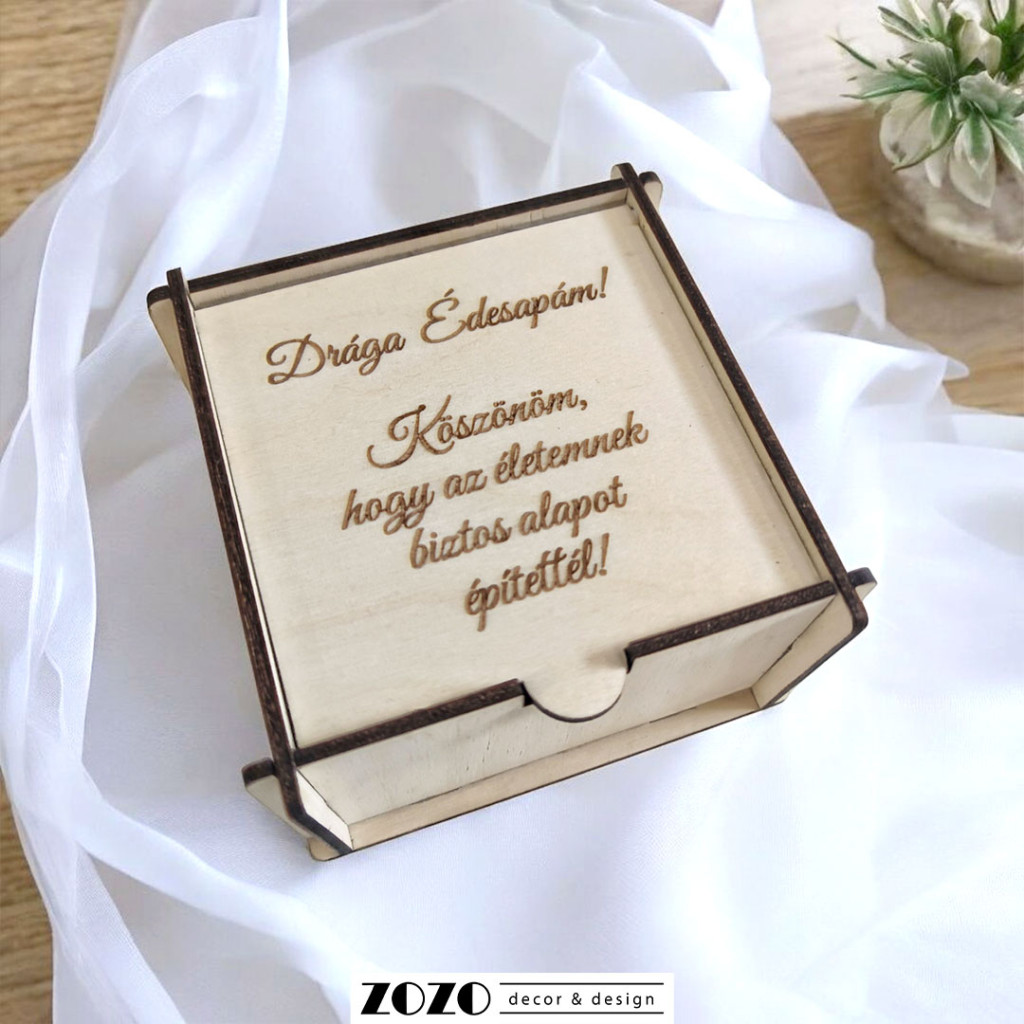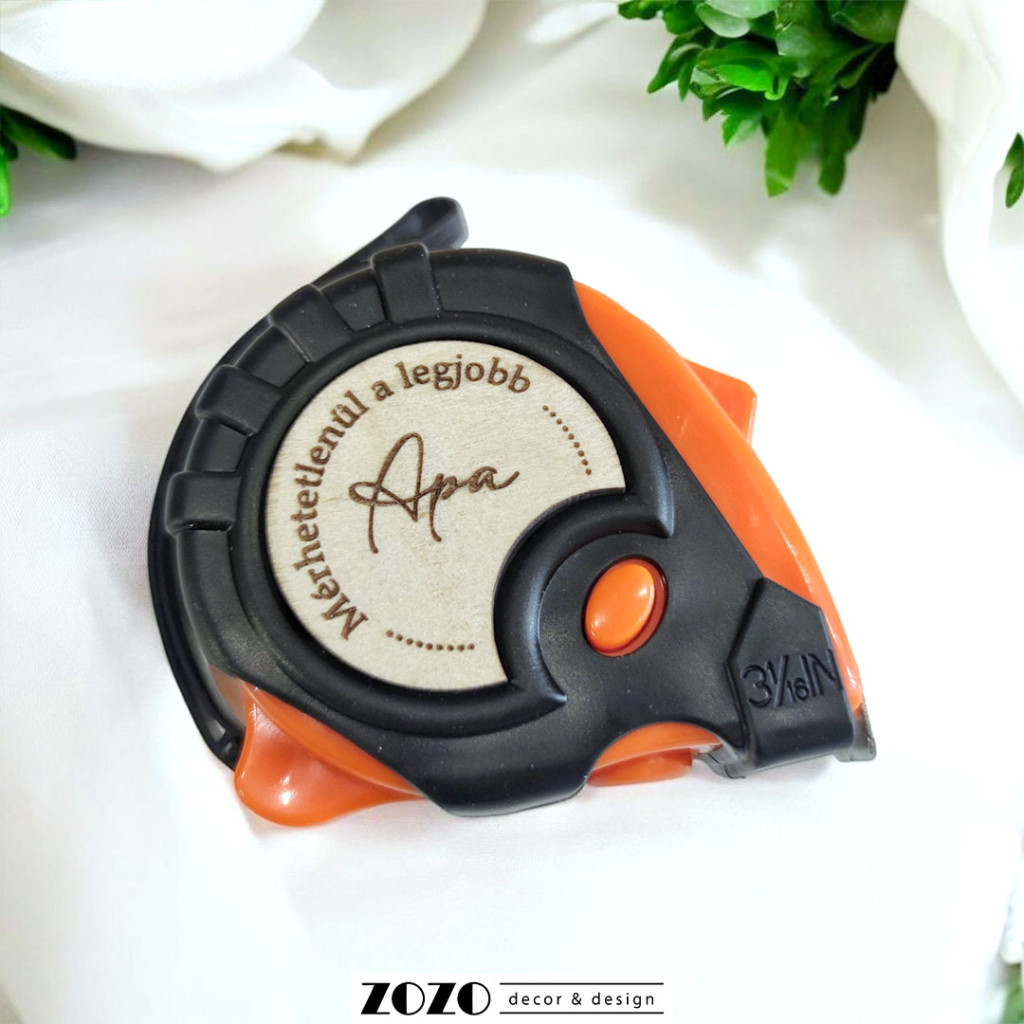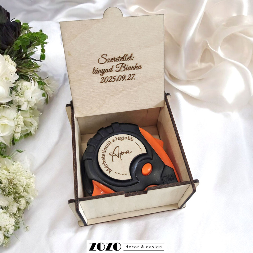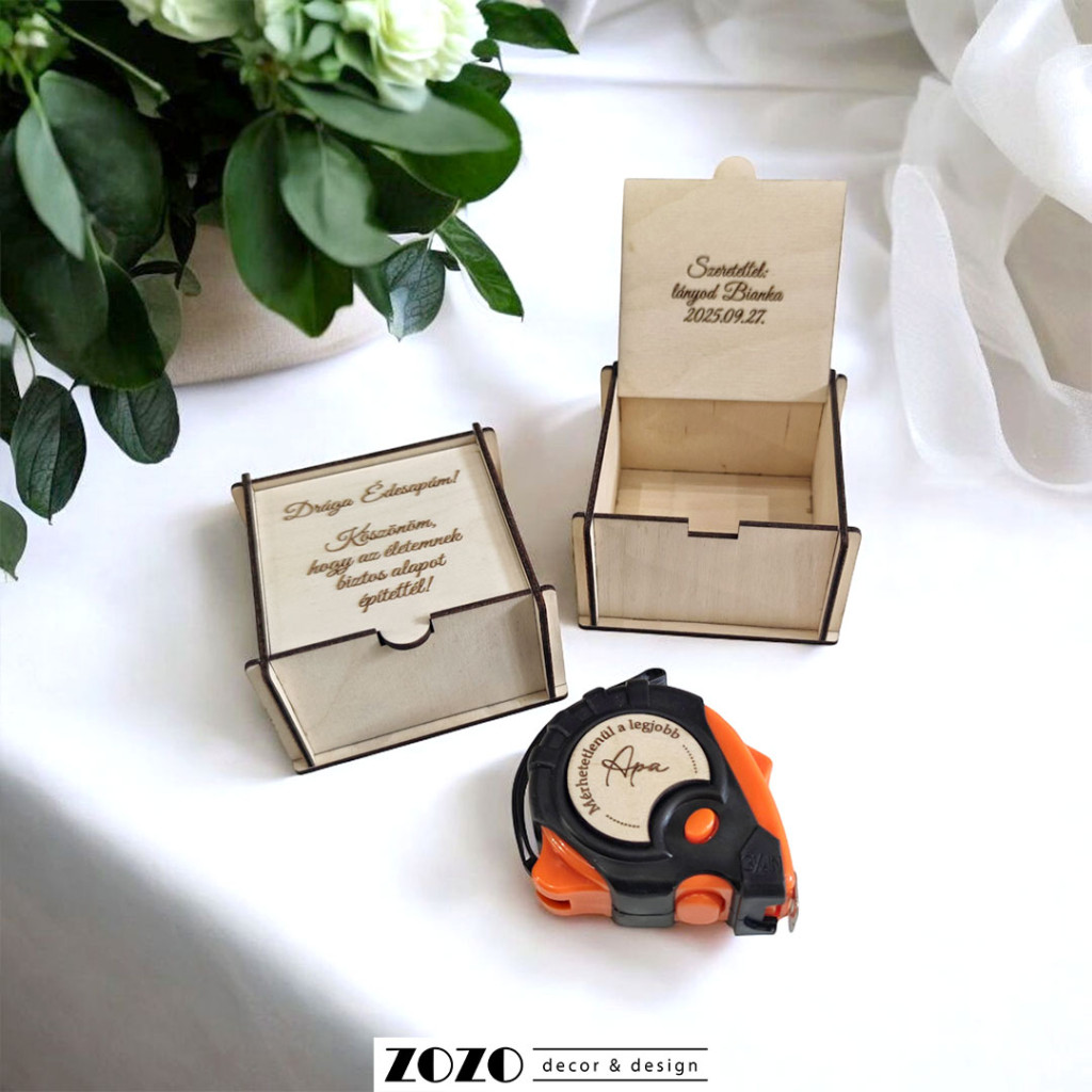 Édesapáknak, nevelőapáknak, keresztapáknak, vagy nagypapáknak szóló különleges köszöntő ajándék a Nagy napra.Az egyedi gravírozott mérőszalag és díszdoboz szívből jövő szavakkal fejezi ki az iránta érzett háládat az esküvőd napján. Elegáns formája és személyre szabható felirata örök emlék marad. Megható ajándék, ami könnyeket csalhat a szemekbe.A díszdoboz mérete:10 cm széles6 cm magas10 cm mélyA mérőszalag minőségi masszív, nagy méretű, 5 méter hosszú fémszalaggal. A mérőszalag külön is megrendelhető! Ha szeretnéd hozzá a díszdobozt is, a legördülő menüben válaszd ki hozzá!A mérőszalag szövege: "Mérhetetlenül a legjobb Apa"A díszdoboz szövege: "Drága Édesapám! Köszönöm, hogy az életemnek biztos alapot építettél!" A név illetve a dátum módosítása esetén nincs szerkesztési díj, viszont ha a további szövegeken szeretnél változtatni (mérőszalag felirata, dobozon lévő egyéb feliratok) annak szerkesztési díja +1000 Ft. Ezt a legördülő menüben tudod kiválasztani.A szükséges adatokat (név, dátum, igény esetén saját idézet/szöveg) a "MEGJEGYZÉS" szövegdobozba írd be, vagy küldd el az info@zozdesign.hu címre megrendelés után.